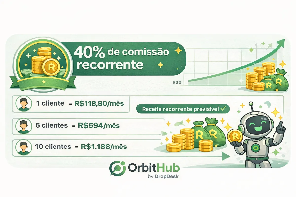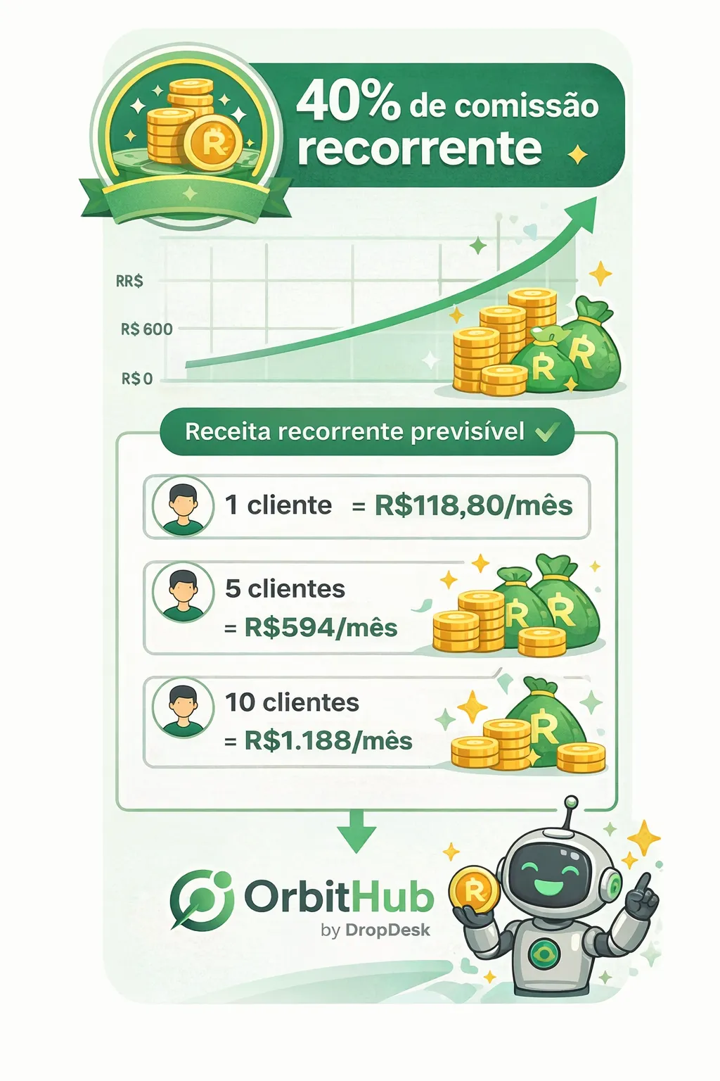 Ganhe 40% de comissão recorrente usando o OrbitHub nos seus clientes.